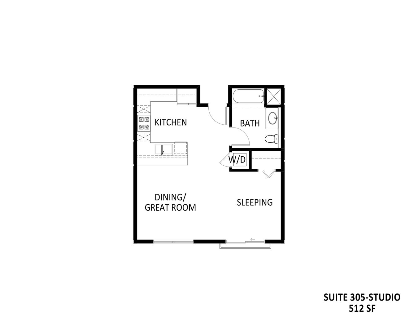 This studio apartment includes a full bath, electric stove/range, dishwasher, refrigerator and in unit washer/dryer (Additional Fee)