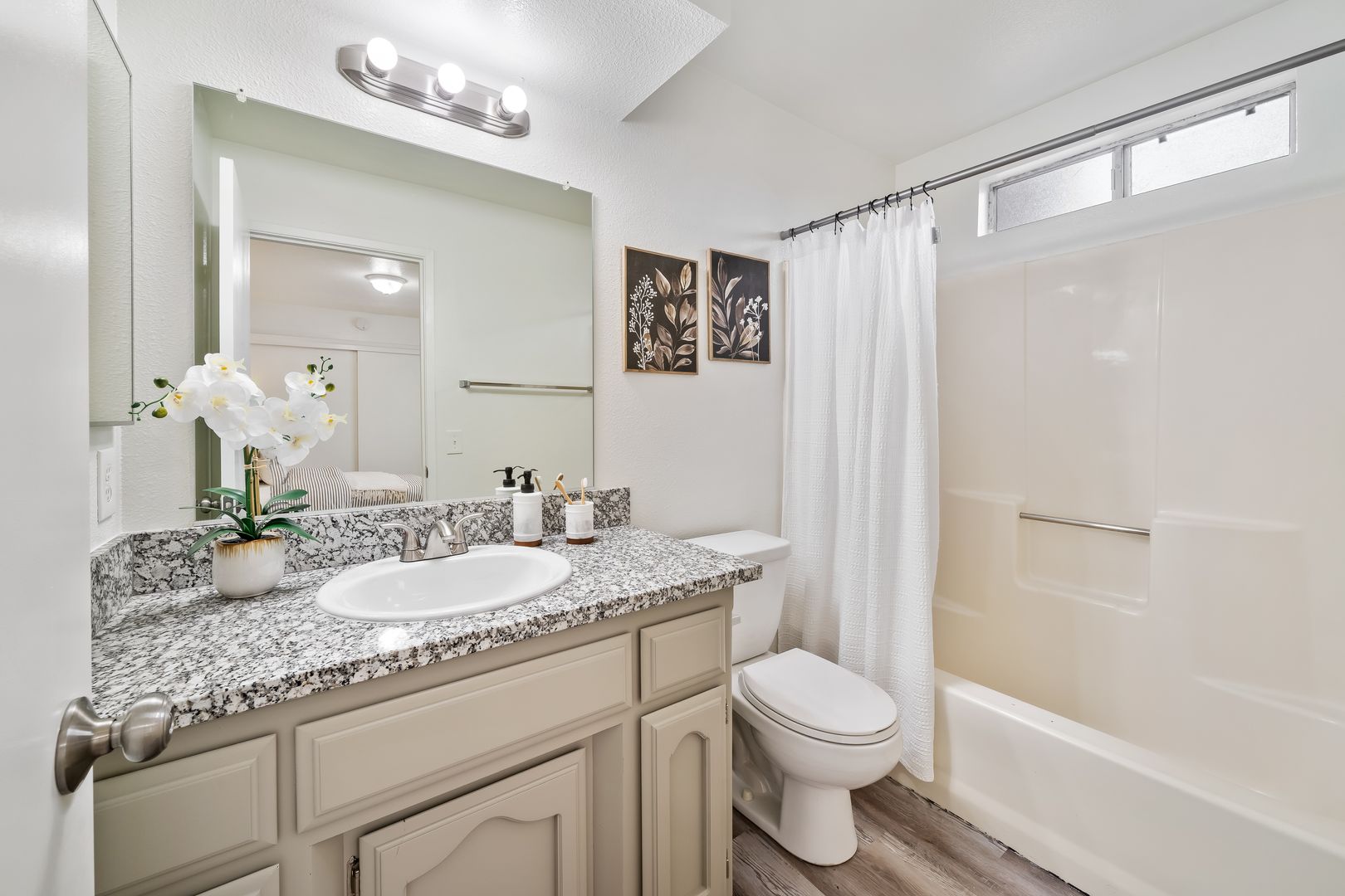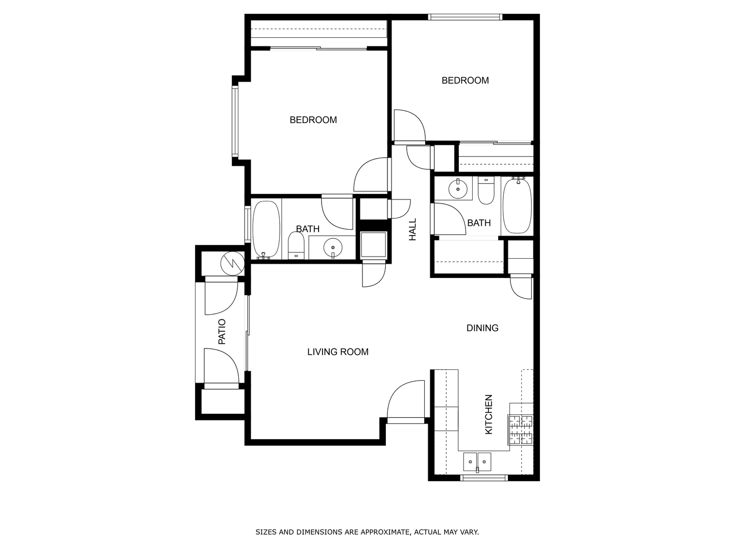 The apartment features two spacious bedrooms with large windows that fill the space with natural light and offer plenty of closet space for storage. The two full bathrooms are equipped with modern fixtures, granite countertops, and shower/tub combinations, providing both functionality and style.