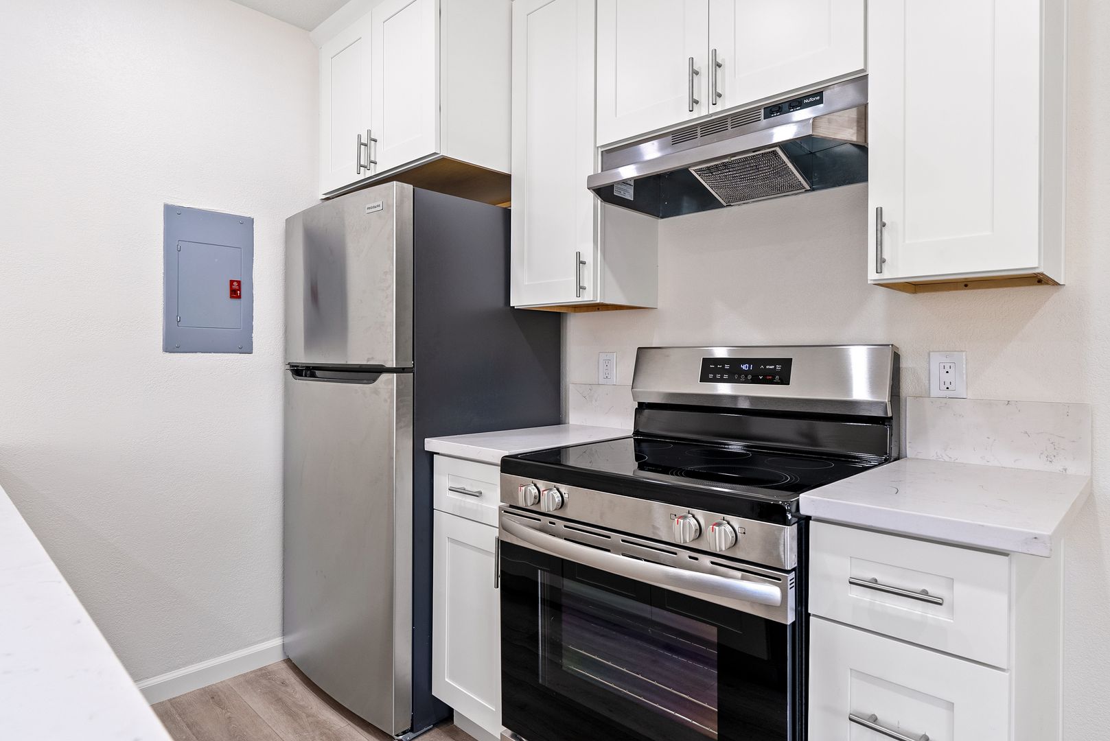 This 1-bedroom, 1-bathroom apartment boasts a sleek stainless steel refrigerator, dishwasher, and range in the kitchen, perfect for whipping up your favorite meals.
